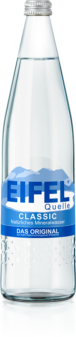 Dann greif doch zu unserem Klassiker, EIFEL-Quelle Classic. Natürliches Mineralwasser mit viel Quellkohlensäure versetzt, enteisent. EIFEL-Quelle Classic, abgefüllt am Quellort, aus der EIFEL-Quelle, Andernach.