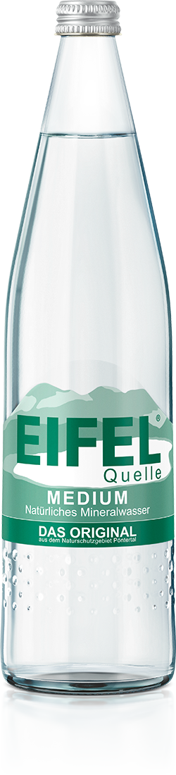 Dann probiere doch mal unsere EIFEL-Quelle Medium. Natürliches Mineralwasser mit weniger Quellkohlensäure versetzt, enteisent. EIFEL-Quelle Medium, abgefüllt am Quellort, aus der EIFEL-Quelle, Andernach.